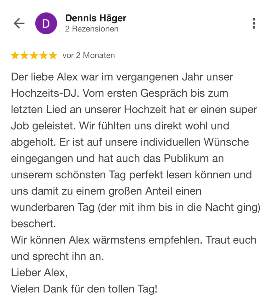 Mir ist wichtig, dass eure Musik perfekt zu euch und eurer Feier passt. Jede Hochzeit ist einzigartig – und genauso individuell soll auch der Soundtrack dazu sein.